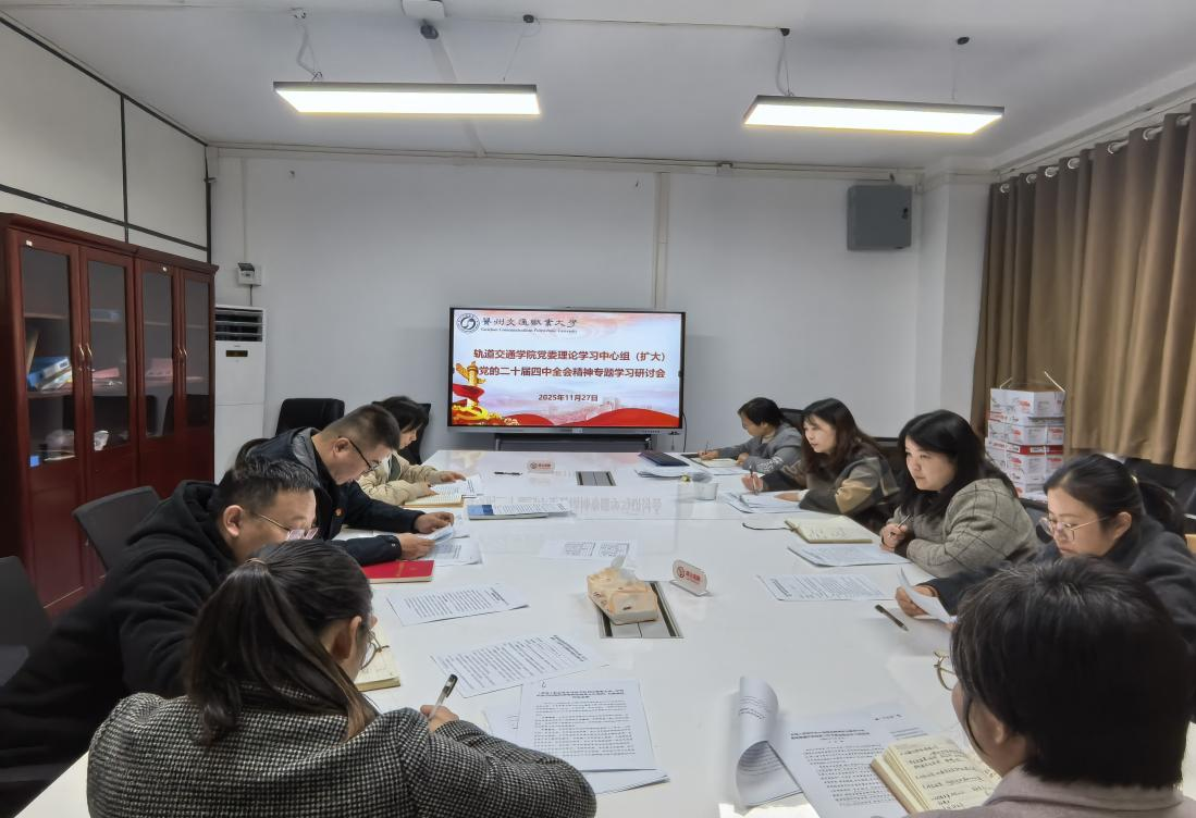11月27日中午13:00,轨道交通学院在五楼会议室召开党委理论学习中心组(扩大)专题学习研讨会,深入学习贯彻党的二十届四中全会精神及相关重要论述。学院党委领导班子成员、全体副科级以上干部参会,会议由学院党委书记杨涛主持。